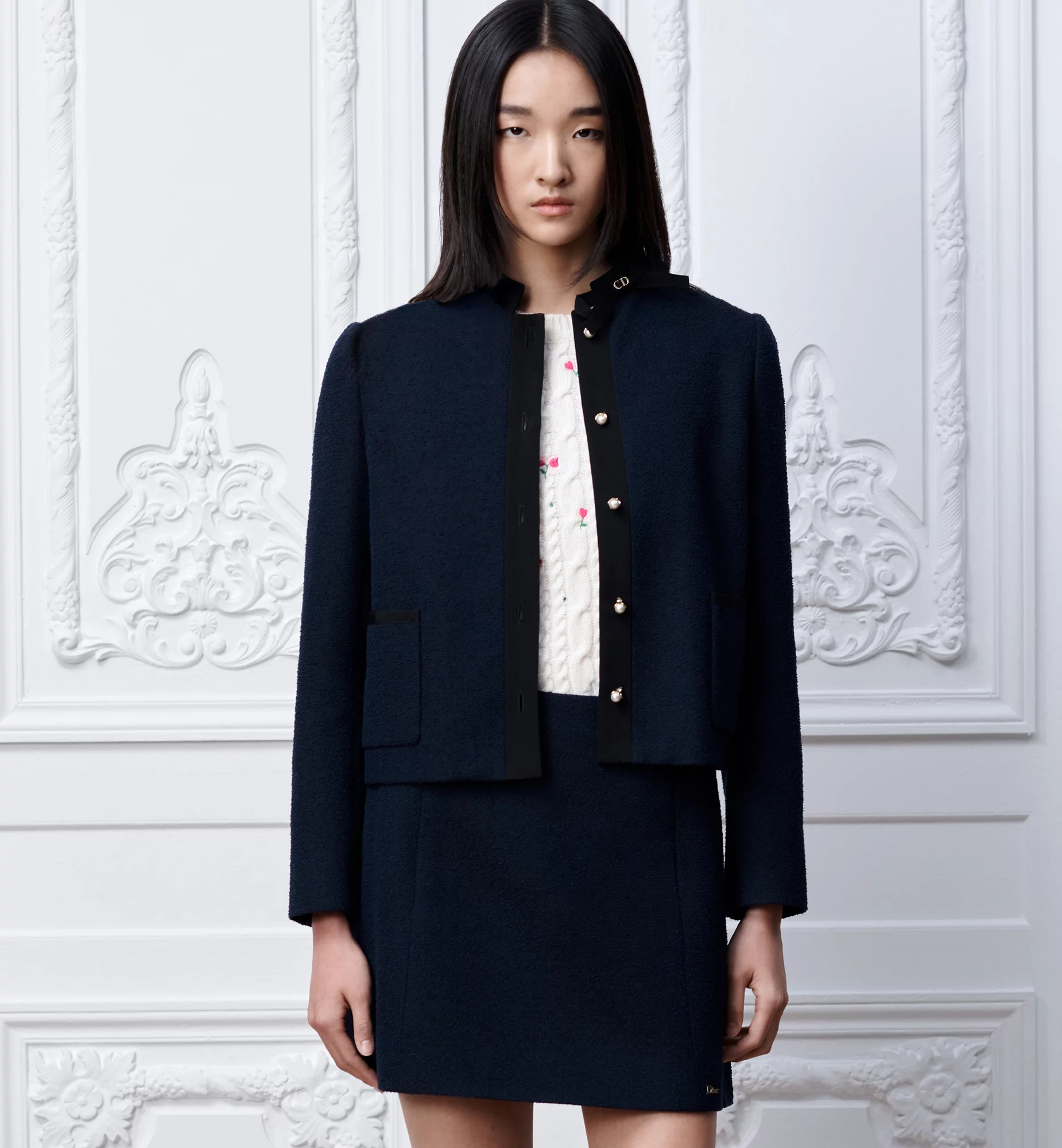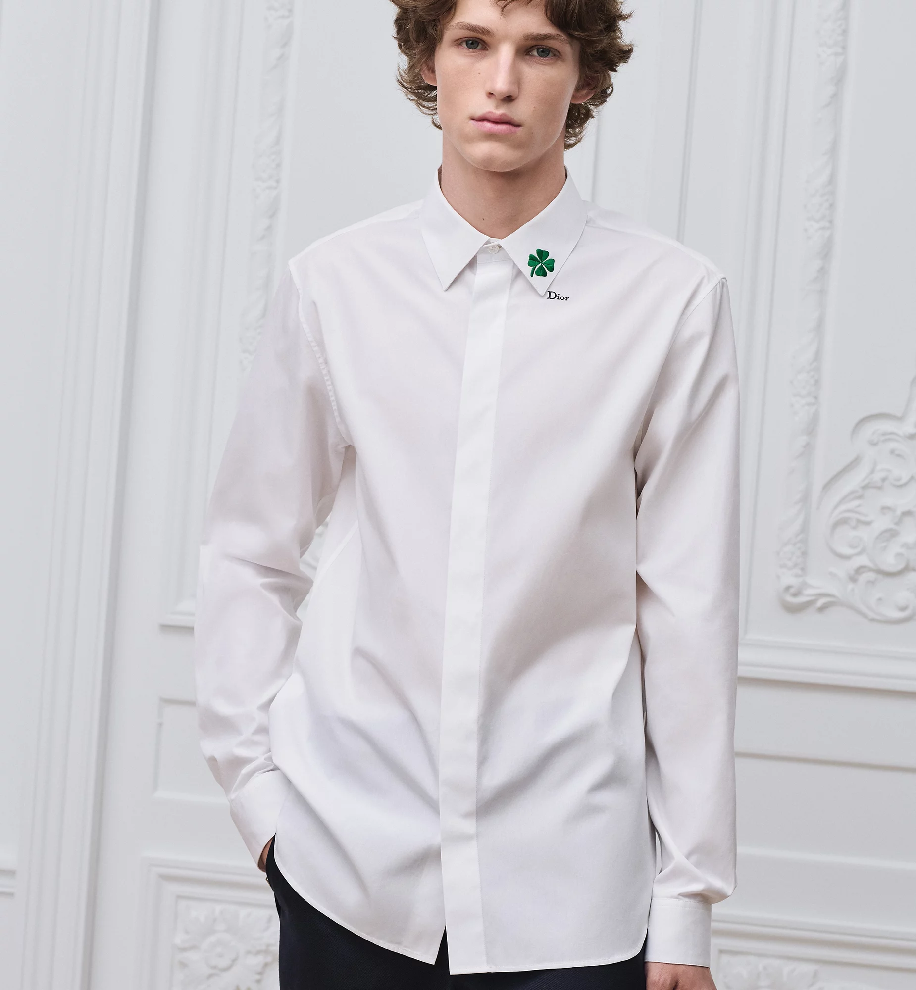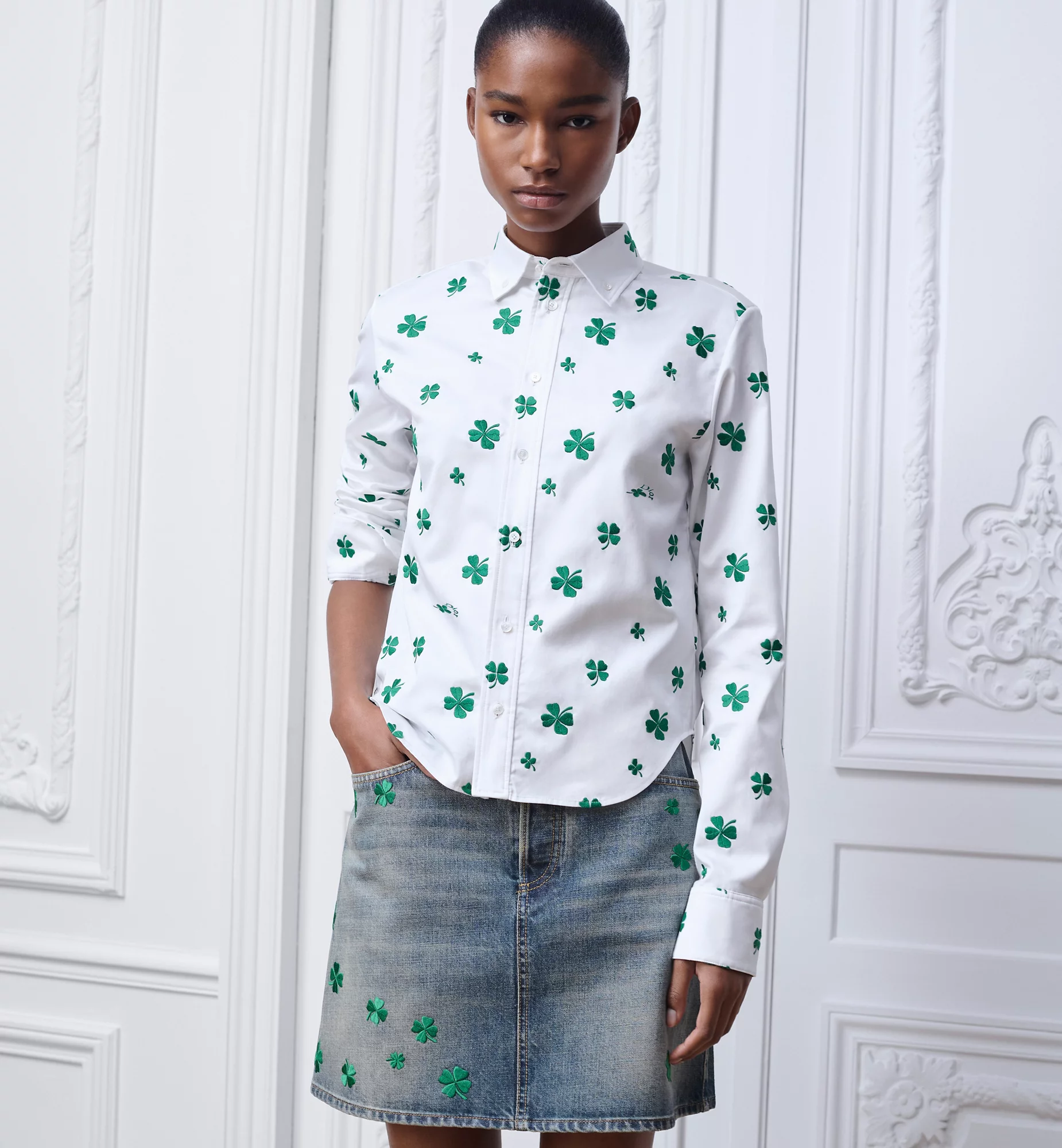 The second theme is embroidery, most notably clover motifs, which appear on shirts, skirts, and sweaters, shoes. In womenswear, clover embroidery is also present. All motifs are executed as embroidery rather than prints.