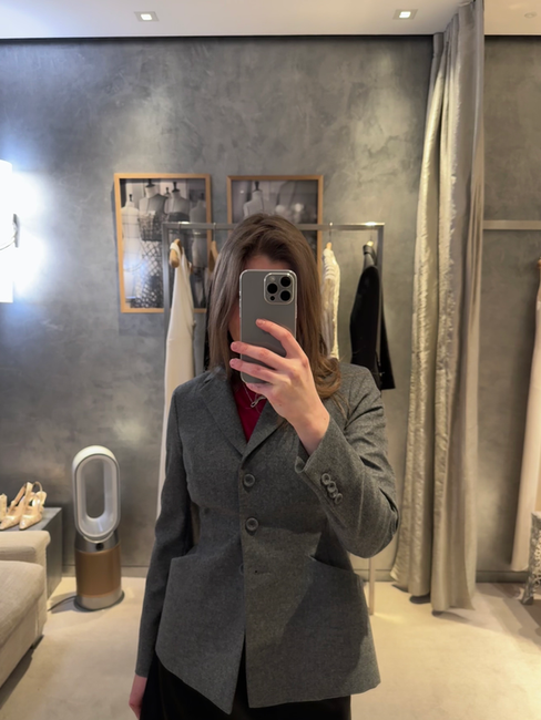 I also tried on two bar jackets. The flannel version is so soft, and so lacking in structural reinforcement, that the pocket was already buckling even without movement. This is difficult to justify for a statement piece.