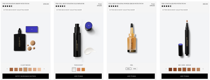 The VB x AB line included the Cell Rejuvenating Power Serum with TFC8®, as well as hybrid makeup products like the foundation drops, illuminator, and concealer pen. Victoria Beckham’s brand already had credibility in luxury makeup, while Augustinus Bader provided the skincare science. The partnership was organic, combining two complementary strengths.