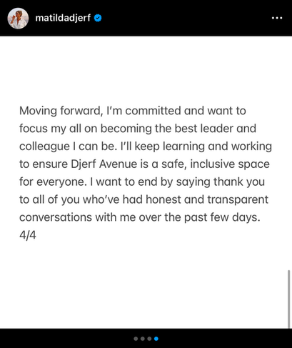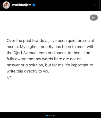 As a counterexample to this situation, consider the December scandal involving Matilda Djerf, a Swedish influencer and founder of the brand Djerf Avenue. In Sweden, an article was published accusing the brand of workplace bullying. Djerf shared her perspective a week later, posting a message on Instagram. Not only was the message itself an example of what not to do, but by then it couldn’t compete with the opinions that had already formed over the course of that week about both the brand and its founder.